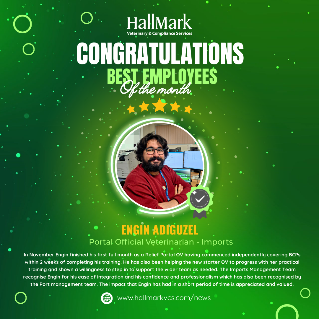 November marked Engin’s first full month working independently as a Relief Portal OV and his impact has already been significant. He stepped into the role with confidence, covering BCPs within two weeks of completing his training. Alongside his own caseload he has supported a new starter OV with practical training, demonstrating patience, technical skill and a willingness to contribute to the success of the wider team. Both the Port leadership and the Imports Management Team have praised his professionalism and the ease with which he has integrated. His early contribution has been invaluable.