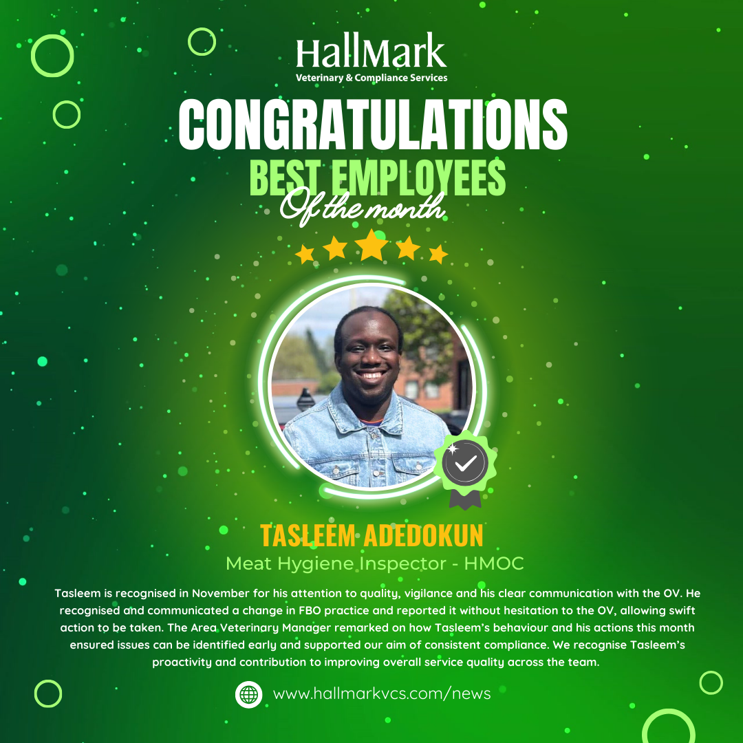 Tasleem is recognised for his vigilance, his calm professionalism and his contribution to maintaining compliance on site. During November he identified a change in FBO practice and communicated it immediately to the OV, ensuring that corrective action could be taken without delay. His Area Veterinary Manager noted that this level of awareness strengthens our service and supports our wider aim of consistent, high quality official controls. Tasleem’s actions exemplify responsible judgement and a commitment to public health that deserves appreciation.